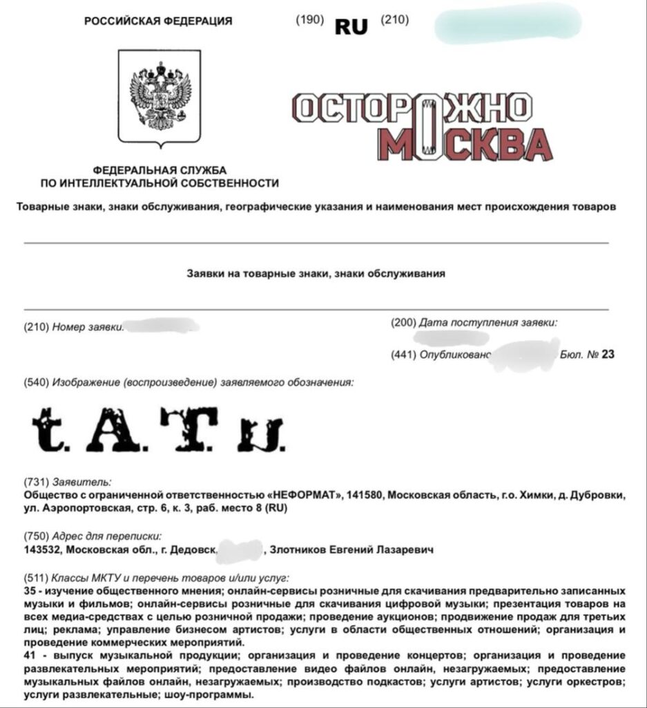An official document from the Russian Federal Service for Intellectual Property, which appears to be a Trademark and Service Mark Application, has surfaced regarding t.A.T.u.